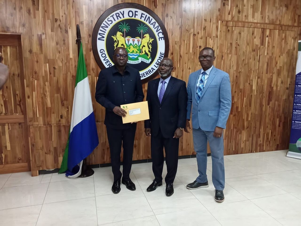 Other senior officials present at the meeting included the Principal Deputy Financial Secretary, Samuel E.B. Momoh; the Deputy Financial Secretary for the Multilateral Project Division, Morie Momoh; and the Technical Adviser to the Minister, Franklin Sisabu Bendu.